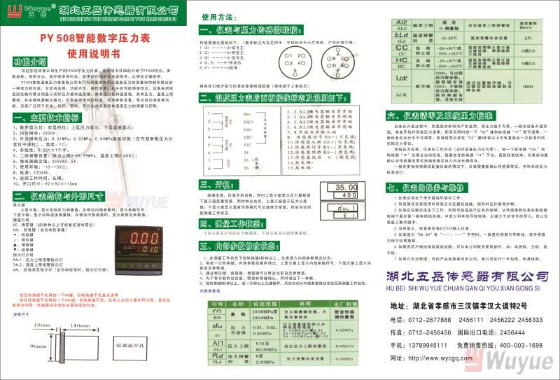 歡迎您選用湖北五岳傳感器有限公司生產的PY508/PY1508智能數字壓力儀表。該說明書詳細的介紹了PY508/PY1508的性能特點,參數指標,使用方法,維護保養等內容。使用前仔細閱讀本說明書,以便您正確使用。